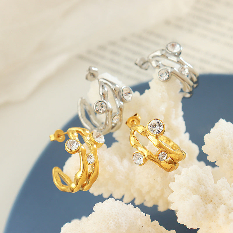 Wir sind stolz, Ihnen leichte, luxuriöse und stilvolle, minimalistische Ohrringe mit C-förmigem Ausschnitt und eingelegtem Zirkon-Design aus 18-karätigem vergoldetem Edelstahl präsentieren zu können. Mit ihrem C-förmigen Ausschnittdesign und den Zirkonen verleihen diese Ohrringe Ihren Ohren ein Gefühl von stilvollem Luxus und schlichtem Stil.