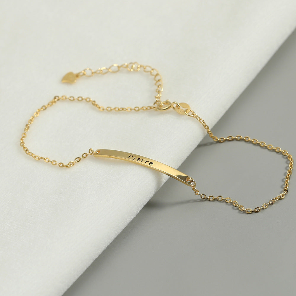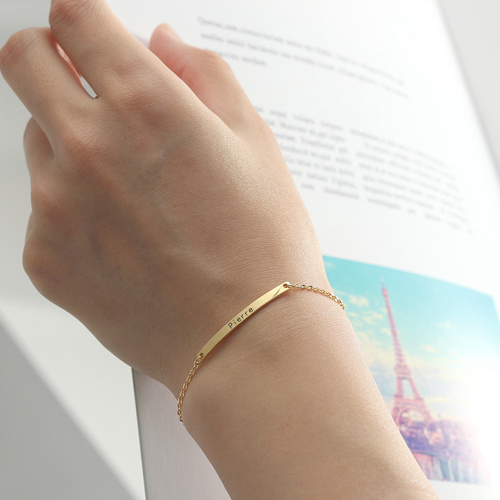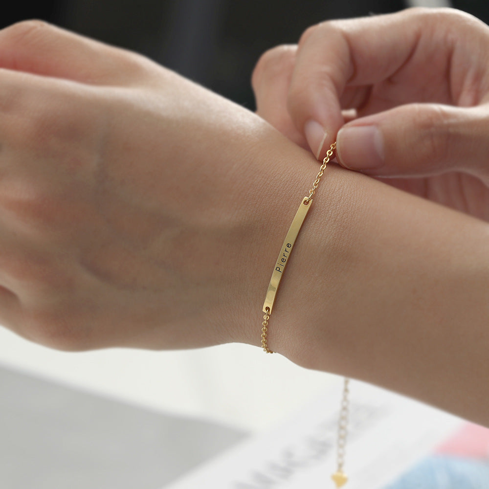 Wunderschönes, modisches, rechteckiges Schild mit anpassbarem Namensdesign. Das Armband im minimalistischen Stil ist ein stilvolles und raffiniertes Armband mit den folgenden Merkmalen: