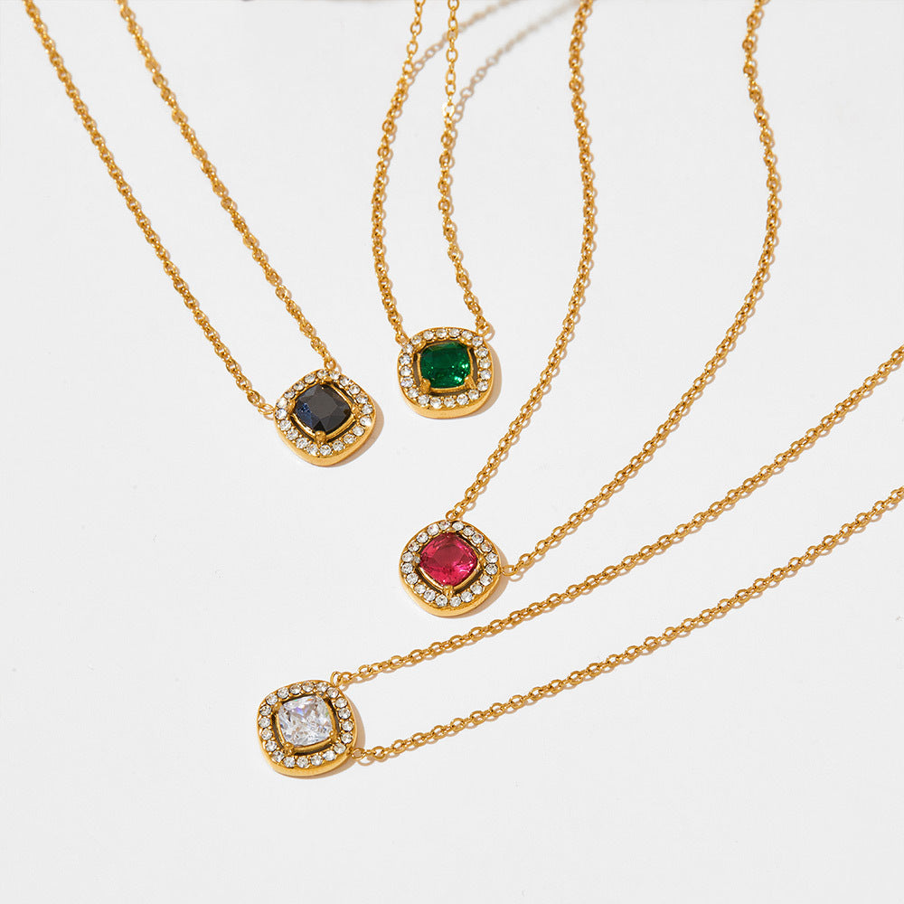 Halskette mit Anhänger aus 18-Karat vergoldetem Edelstahl im Retro-Stil mit eingelegtem Zirkon-Design