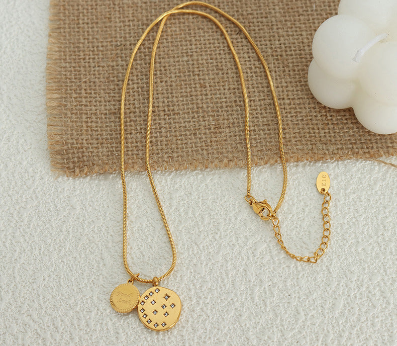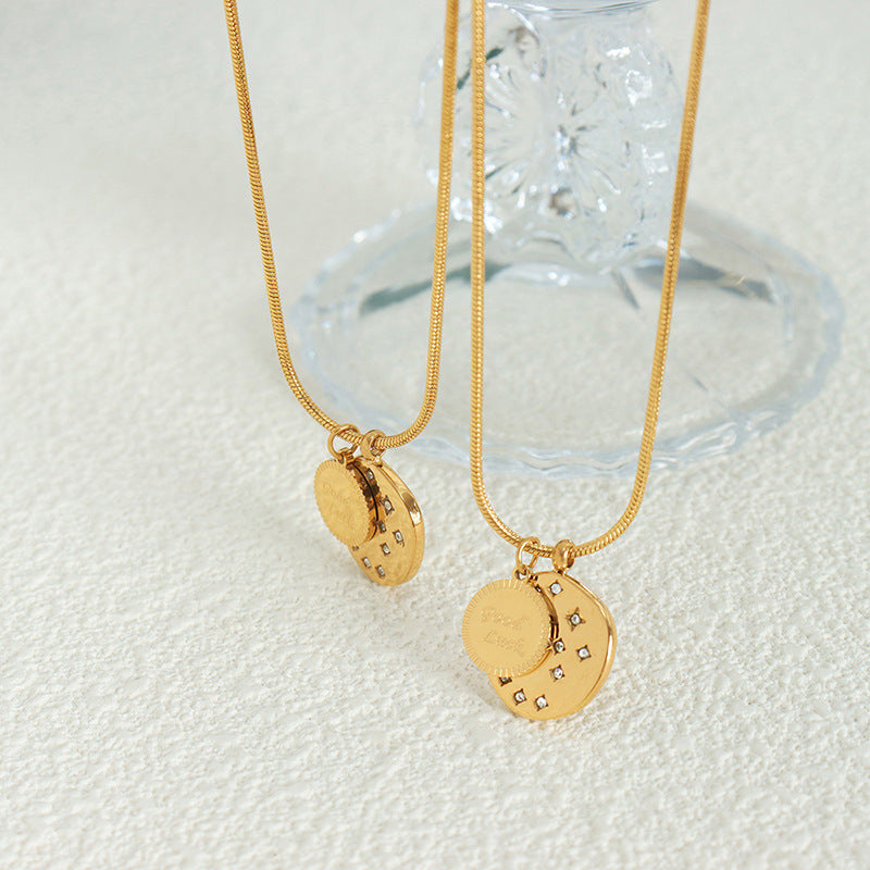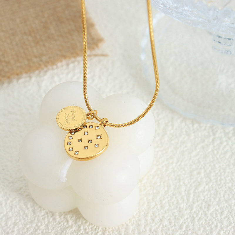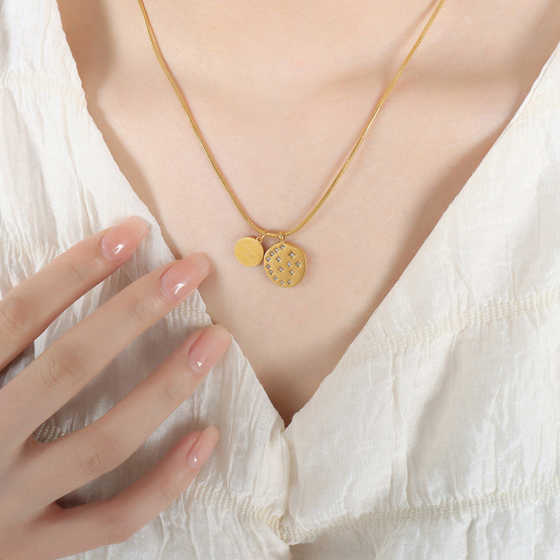 Modische und schlichte, unregelmäßige, runde, eingelegte Zirkon-Halskette mit runder Platte aus 18-Karat vergoldetem Edelstahl mit Anhänger im „VIEL GLÜCK“-Design