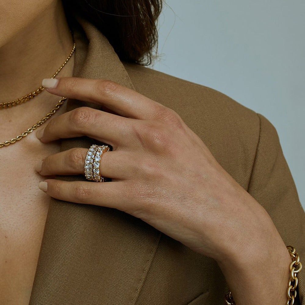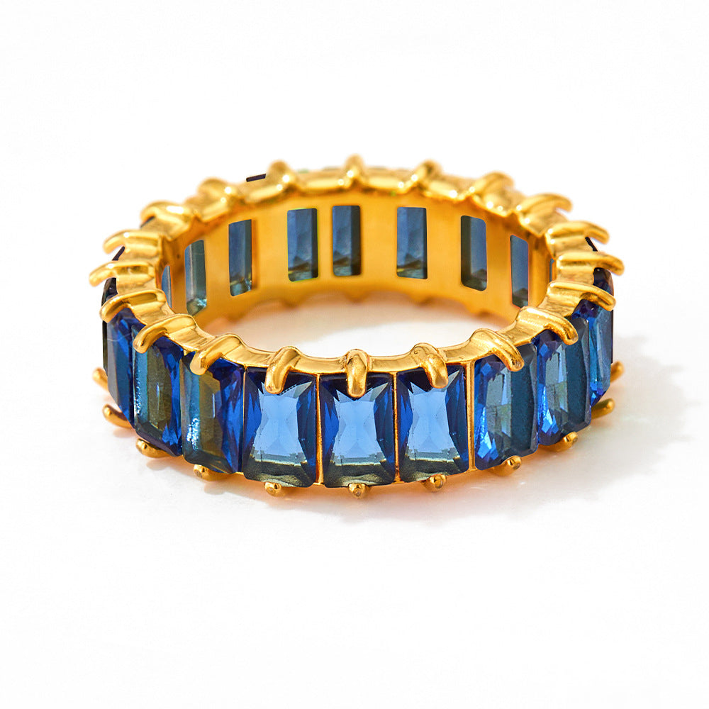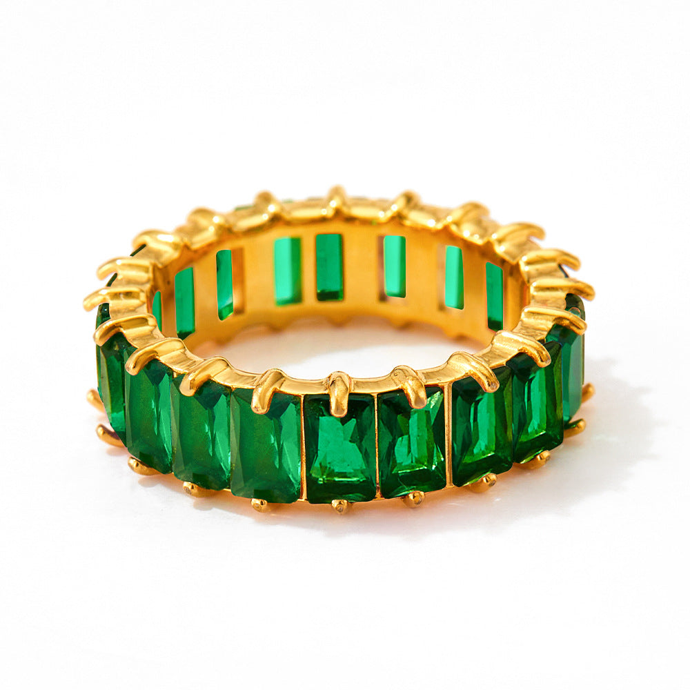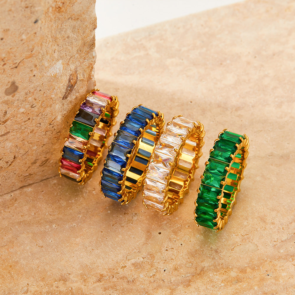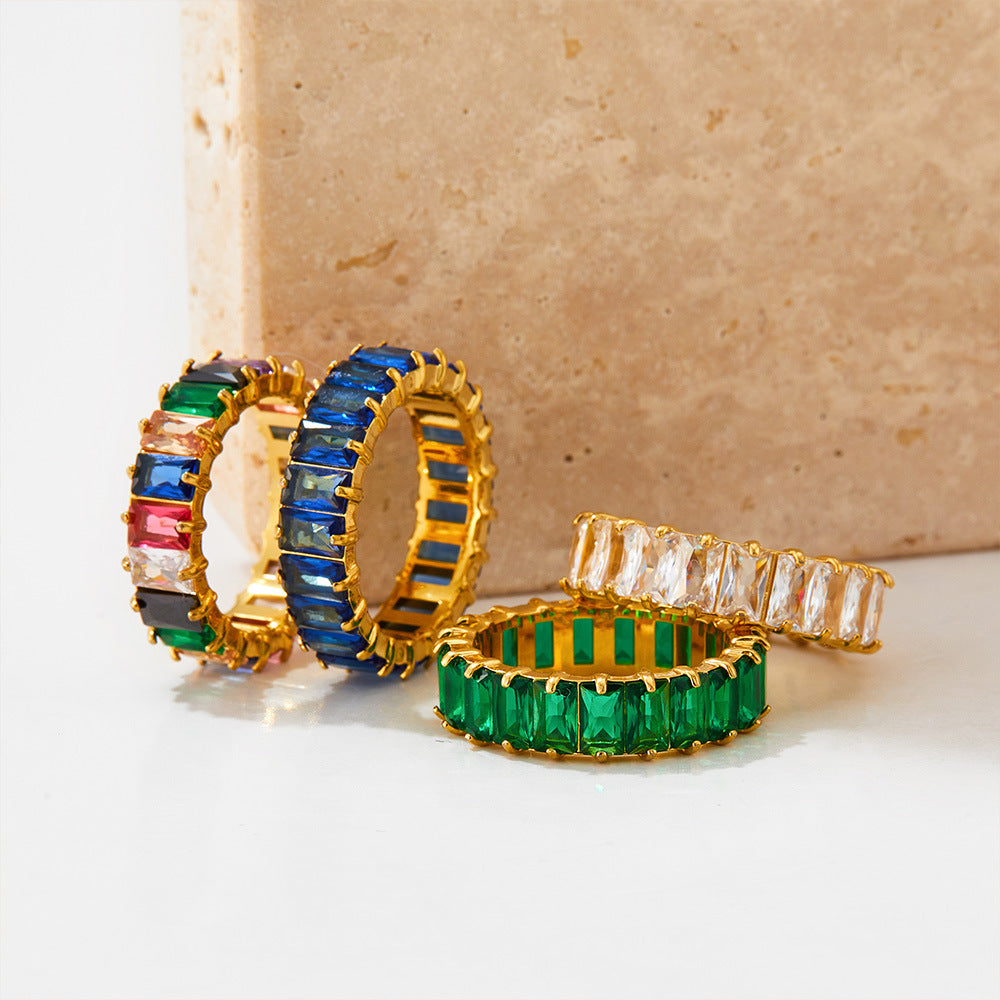 Quadratischer Zirkon: Dieser Ring ist mit quadratischem Zirkon besetzt. Das Design des quadratischen Zirkons verleiht dem Ring eine einzigartige geometrische Schönheit.