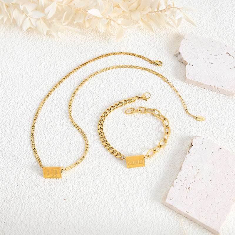 Dieses neuartige und modische, sich verjüngende Armband- und Halsketten-Set aus 18-karätigem vergoldetem Edelstahl mit Smiley-Gesicht und „Smile“-Design hat eine lebendige und entspannte Atmosphäre und eignet sich für einen fröhlichen und fröhlichen Sinn für Mode. Hier finden Sie eine detaillierte Beschreibung dieses Sets: