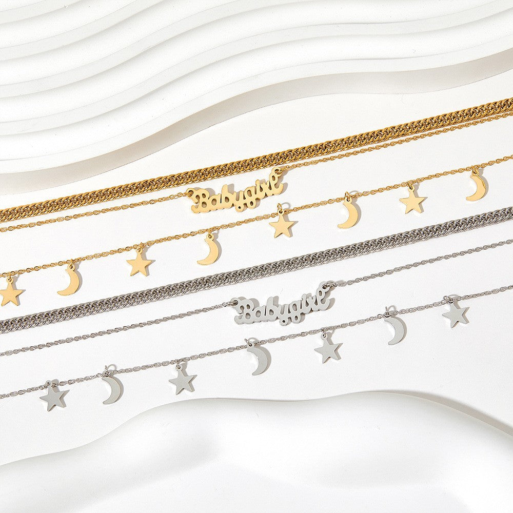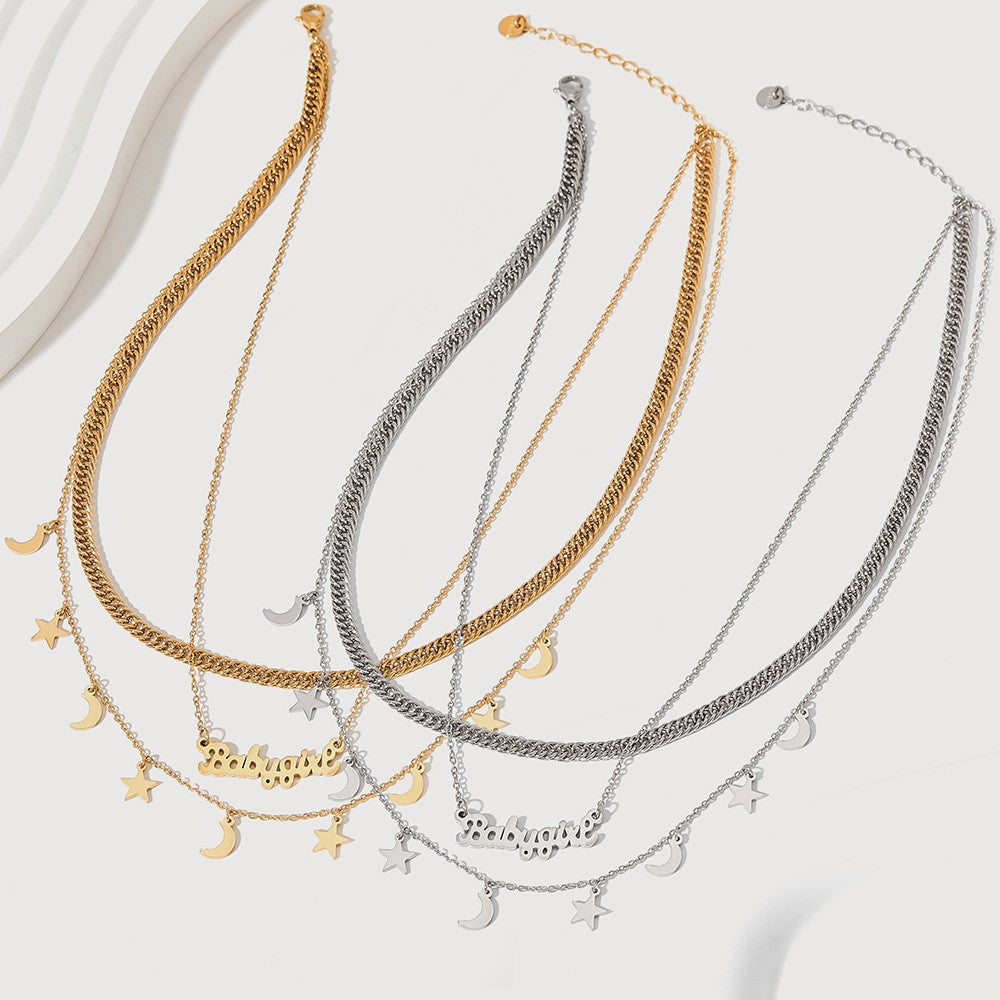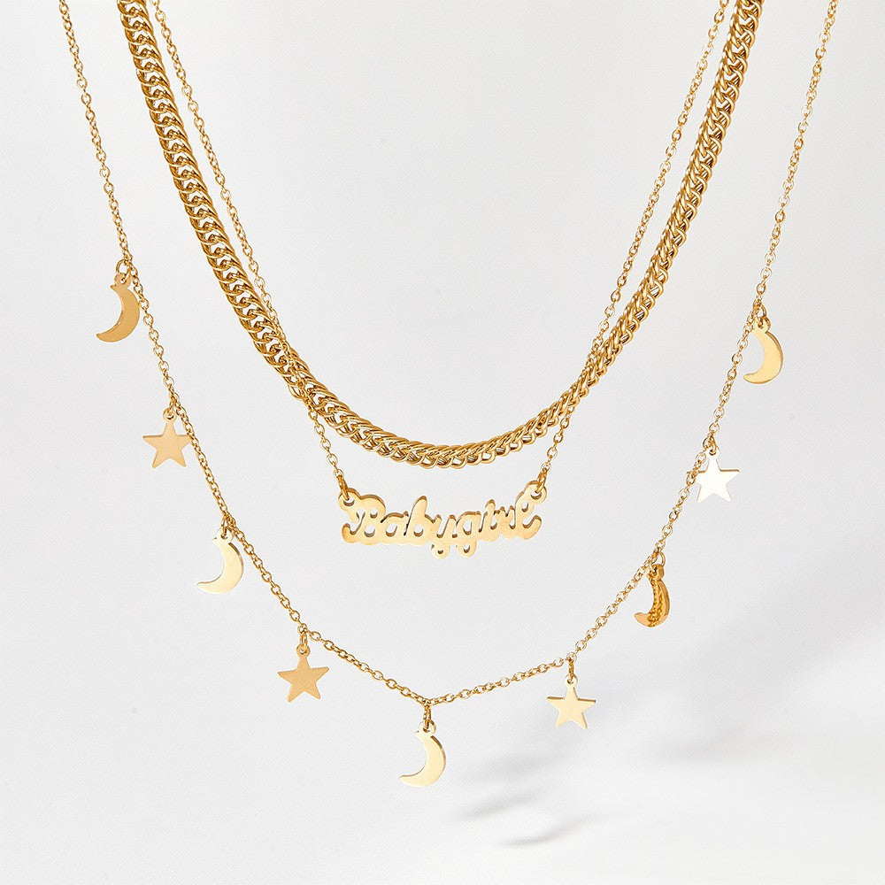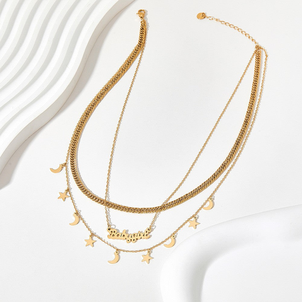 Trendige Mode-Halskette aus 18 Karat vergoldetem Edelstahl mit Sternen und Mond mit Buchstaben, dreilagiges, gestapeltes Design