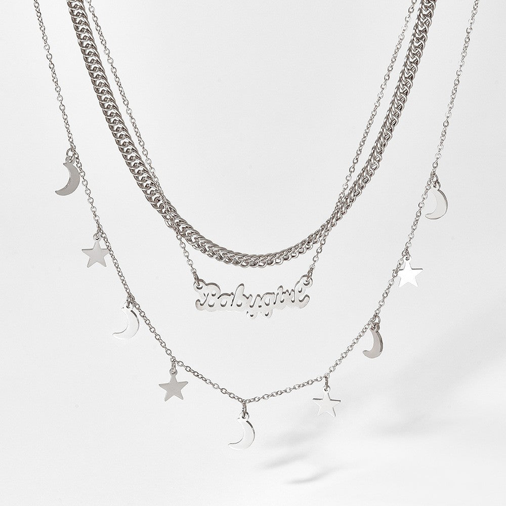 Diese Halskette aus 18-K vergoldetem Edelstahl vereint eine Vielzahl beliebter Elemente, darunter Stern-, Mond- und Buchstabendesigns, und wird in einer dreischichtigen Stapelweise präsentiert, sodass Sie Schmuck voller Charme und Sinn für Mode erhalten.