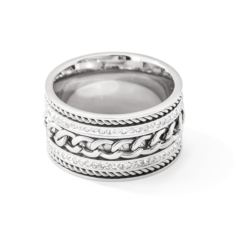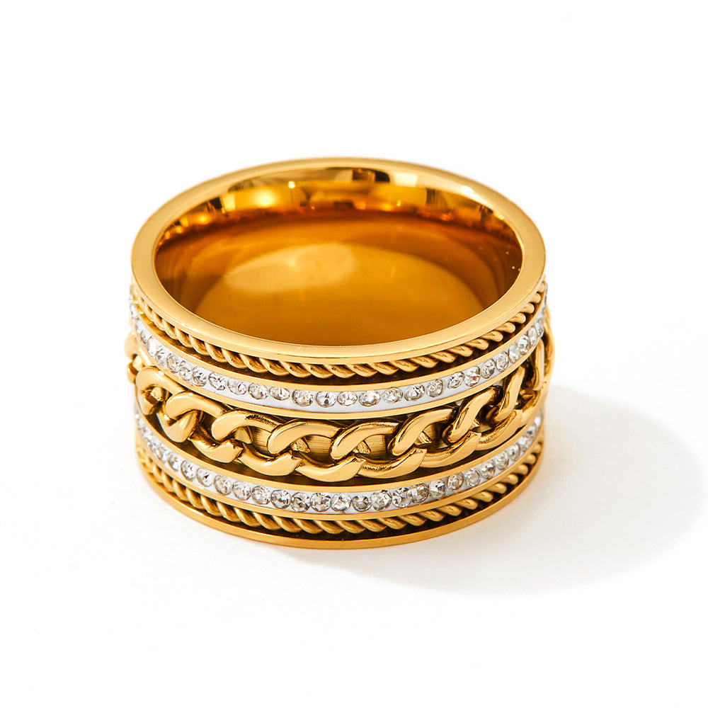Trendiger und personalisierter, breitflächiger, zweireihiger, diamantbesetzter Ring aus vergoldetem Edelstahl, mit gedrehtem Kettendesign