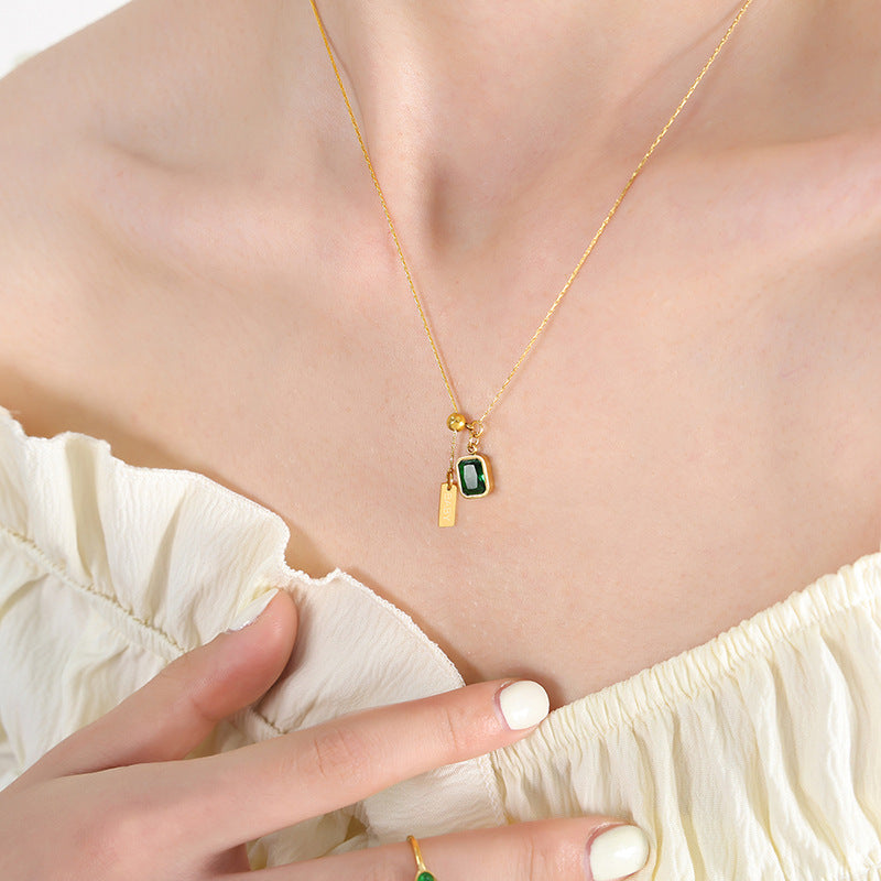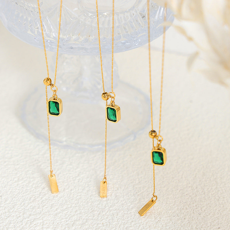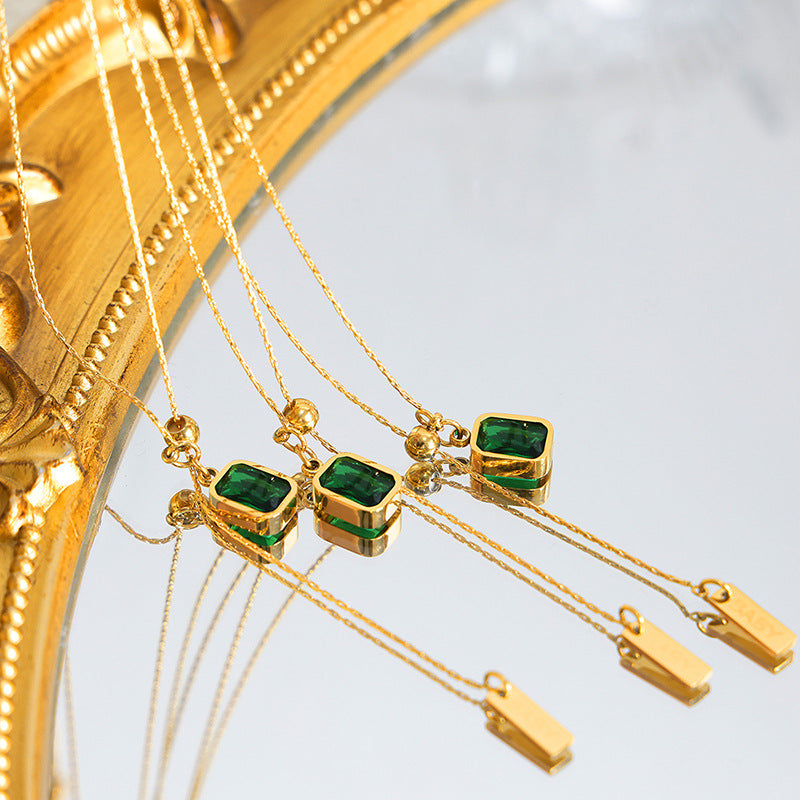 Vielseitige Halskette aus 18-Karat vergoldetem Edelstahl mit exquisiter und edler quadratischer Einlage aus Zirkon und Quaste