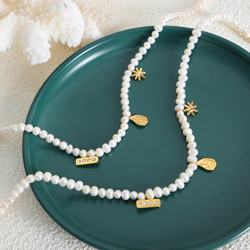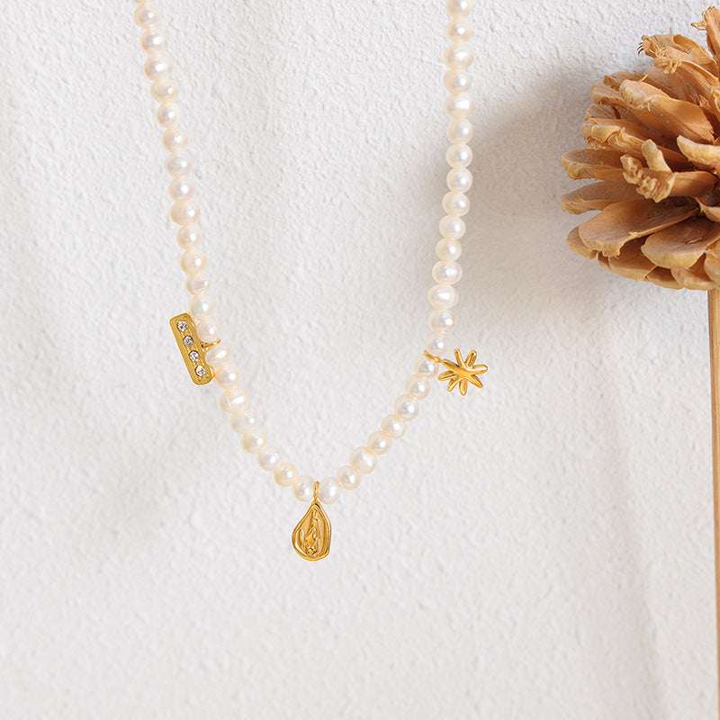 Diese Halskette aus 18-karätigem vergoldetem Edelstahl besteht aus Perlen gepaart mit einem unregelmäßig geformten Design und präsentiert eine raffinierte und dennoch stilvolle Schlichtheit. Es handelt sich um eine vielseitige Halskette, die zu verschiedenen Anlässen und Outfitstilen passt.